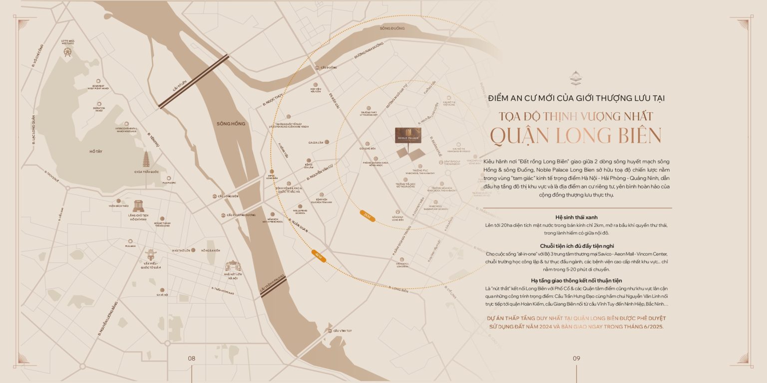 Là dự án hiếm hoi có vị trí đắc địa nằm trong khu vực giao hòa của những trục đường chính của thành phố, điều đó giúp cho việc di chuyển đi lại của cư dân Noble Palace Long Biên là rất thuận tiện, đặc biệt là đi tới khu vực quận Tây Hồ, quận Hoàn Kiếm, quận Ba Đình, quận Hai Bà Trưng… thông qua 2 cây cầu: cầu Long Biên và cầu Chương Dương. Dự án Noble Palace Long Biên sở hữu tầm nhìn Panorama 360 cực đỉnh, View thoáng rộng nhìn thẳng ra sân Golf, khu công viên hồ điều hòa.